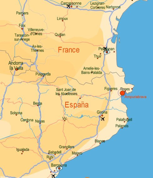 La maison est située à Ampuriabrava, petit paradis terrestre et maritime baptisé "perle de la Méditerranée" ou encore "Venise espagnole". Ampuriabrava est la plus grande marina d'Europe avec plus de 5000 points d'amarrages, près de 30 km de canaux navigables et deux immenses plages de sable doré. La maison est désservie par le premier canal (à moins de 10 minutes de la mer en bateau) et n'est qu'à quelques 500 mètres seulement des plages (5 minutes à pied).